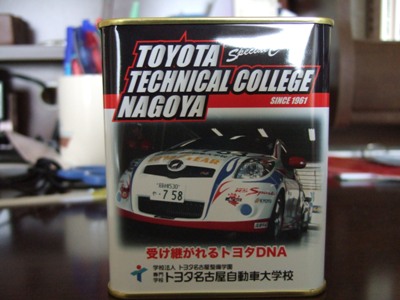 これは帰りにもらった懐かしきサクマドロップです。(中身は) 久々に一滴も雨が降らなかった日なので、暑かったなぁ。 まあ、凄かったですわ。 名の通りトヨタの直結校でして、実技授業では2人に1台クルマを整備できるんだとか。 ・・・あながちウソじゃないみたいだぜ。至る所にトヨタ車がありましたから。 まず先導してもらって、施設見学をしました。 施設に入った瞬間から空気が変わりましたよ。有機溶剤の臭いがたまらんよ。 初めはエアバッグ展開実験でしたね。 5・・4・・3・・2・・1・・ボン!!!! ビックリでしたね。 そしたらお次は自衛隊でも使われるメガクルーザー。 デカイの何の、シートが横に4人乗れるとは。タイヤもデケェ~。 歩いて早速・・・おおっ!・・・主役のお出ましですな。 F3000が来ました!古めですが、ミッドシップにはコスワース製エンジンが! そしておっちゃんたちがガチャガチャやってます・・・・。まさか・・・・。 ブルルル・・ヴォオオオオオオンン!!!!!!ゴゴゴゴゴゴ・・・・ヴゥオオオン!!!ヴォオオオオオオンン!!!!!ヴォオオオオオオオオオオオオオオオン!!!!!!!! 当然自分の言っていることが、誘ってくれた隣の友人にすら伝わらない、耳を貫くけたたましい轟音でした。 あれでも5000rpmだったとは・・・・。ドライバーは大変なんだなぁ。 これが一番ビビりましたねwww そこの先のレース用車両展示を見ました。 ネッツカップヴィッツレースの車両や、学生フォーミュラなどがありました。 そこの隣にはとんでもない数のトヨタ車が集まる、広い整備工場でした~。 そこで記念撮影もしました。 授業の施設の中には、トランスミッション、エンジン、デフギアや電子回路、スパークプラグの放電など各パーツが各教室で分解されてました。 エンジンのとこでは1台カートが置いてありました。ホイールは見事にRAYS製TE37(ブロンズ)でしたよ! あとV8、ボクサー、ロータリー、直4のエンジンが展示されてました! あとは衝突体験もしました。エアバッグにはビビりました・・・・。 昼は食堂でジャージャー麺を食べて、午後に移ります。ズルズルっ。 午後は整備工場にセットされていた直4エンジンを始動して、エンジンに重要なものを学びました。 「良い混合気・圧縮・点火」をテーマにエンジンに色々いたずらしてくれました。 エンジンのプラグの電流を抜いたり、空気の吸入を止めたり、カムのタイミングを変えたりして調子が悪くなることが分かりました。 最後にエンジンの重要な部分であるピストンを外してみました。 とりあえずツルツル滑りますね。ピストンが上下するのを見て、惚れ惚れしましたww いや~、楽しかった!場所も意外と近かったです。
